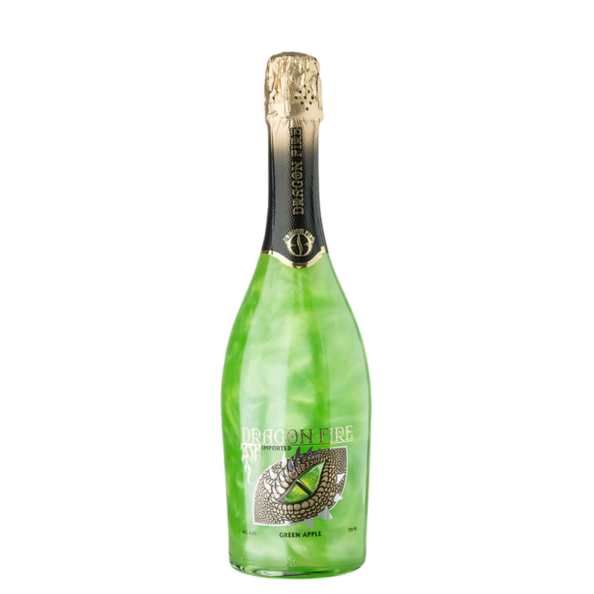 Dragon Fire Green Apple Moscato Crisp, tangy green apples and refreshing Moscato lay perfectly balanced across the palate. Bright green color with shimmery streaks of white and silver. Featuring shimmery white and silver streaks when you swirl the bottle.