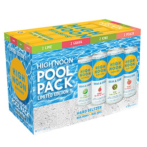 High noon pool pack hard seltzer is made with real vodka and real fruit juice sparkling water and natural flavors. Only 100 calories no added sugar and gluten free. The perfect way to make a splash at your next pool party just as long as you remember to share!