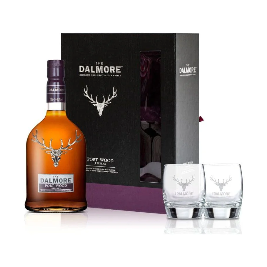 This gift pack includes a bottle of the Dalmore Port Wood Reserve, along with two glasses adorned with the iconic Dalmore stag, making it a perfect gift for whisky enthusiasts._x000D_