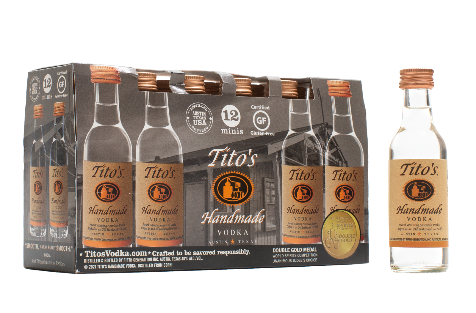 Tito’s Handmade Vodka is America’s Original Craft Vodka. In 1995, Bert “Tito” Beveridge obtained the first legal permit to distill in Texas and created Tito’s Handmade Vodka. We batch distill our corn-based vodka using old-fashioned pot stills and the vodka is naturally Gluten-Free. Tito’s Handmade Vodka is distilled and bottled by Fifth Generation Inc. in Austin, Texas on the very same land where the whole venture started.